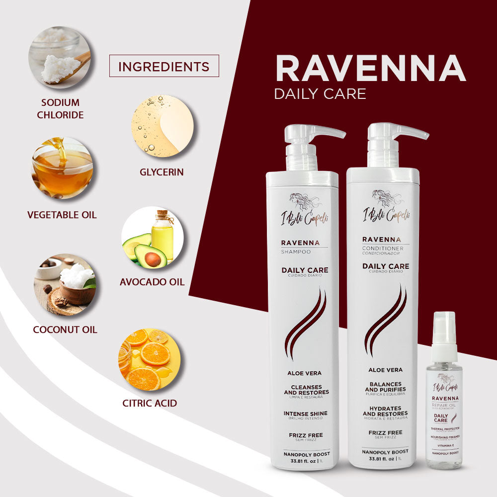 The Ravenna Daily Care Kit was designed to provide a complete hair care routine with gentle cleansing, deep hydration, and intense protection. This trio includes a shampoo, conditioner, and split end repair oil, delivering stronger, softer hair with a radiant shine.