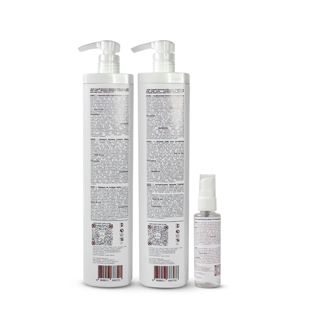 Enriched with Aloe Vera, the shampoo gently cleanses and balances the scalp, while the conditioner locks in moisture, leaving the hair light, smooth, and easy to manage. To complete the routine, the Ravenna Repair Oil works as a finisher that prevents dryness and protects against damage caused by chemical treatments, straightening, or coloring-keeping the strands healthy and shiny.