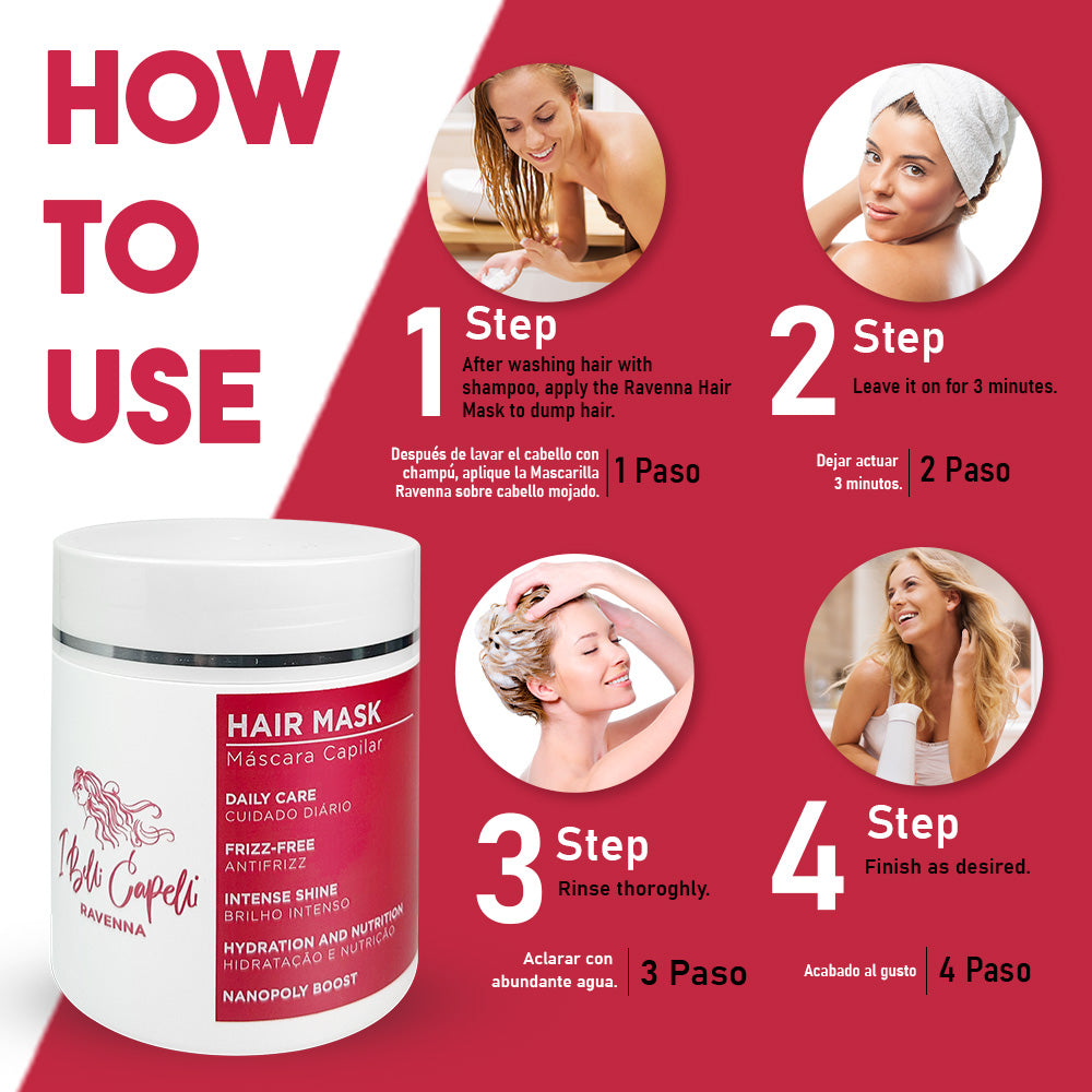 3. For a more intensive treatment, apply the Ravenna Hair Mask to clean, damp hair, distributing it along the lengths and ends. Leave on for 3-5 minutes and rinse thoroughly.