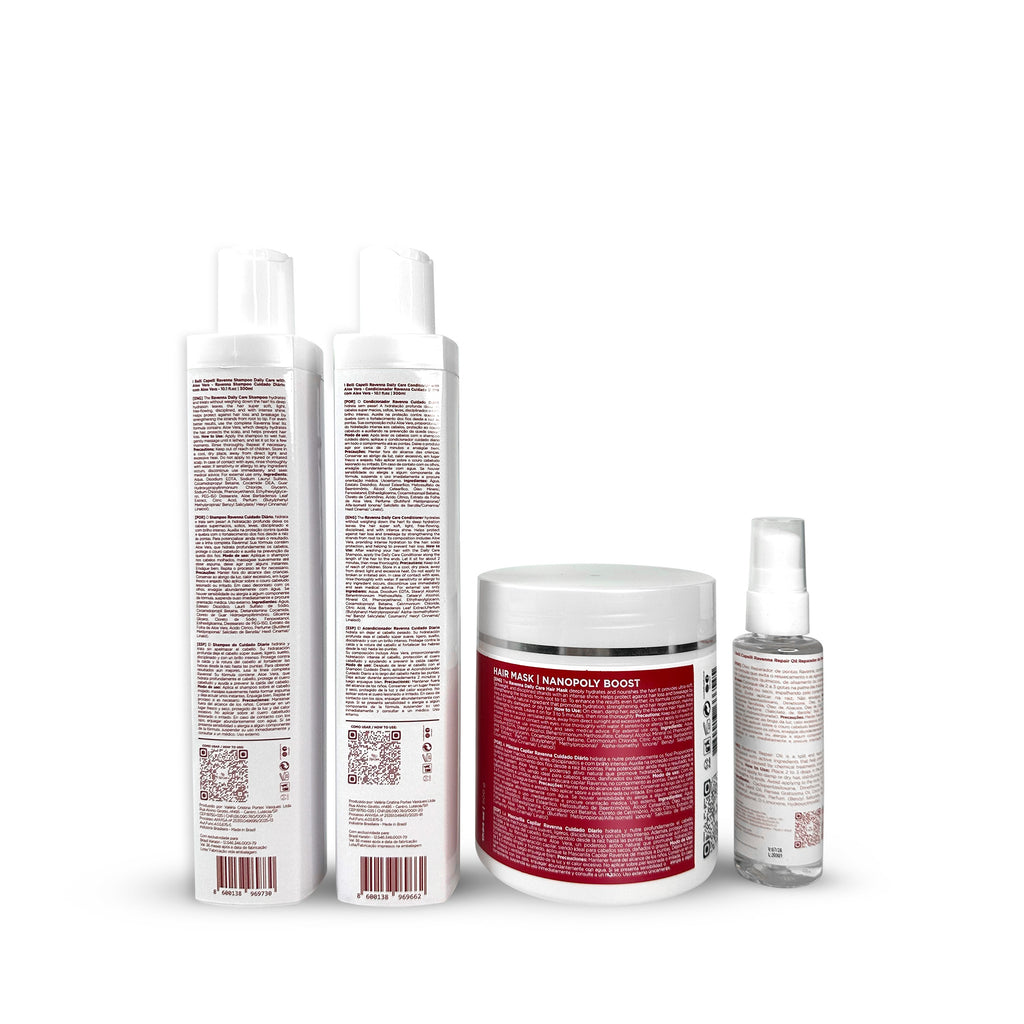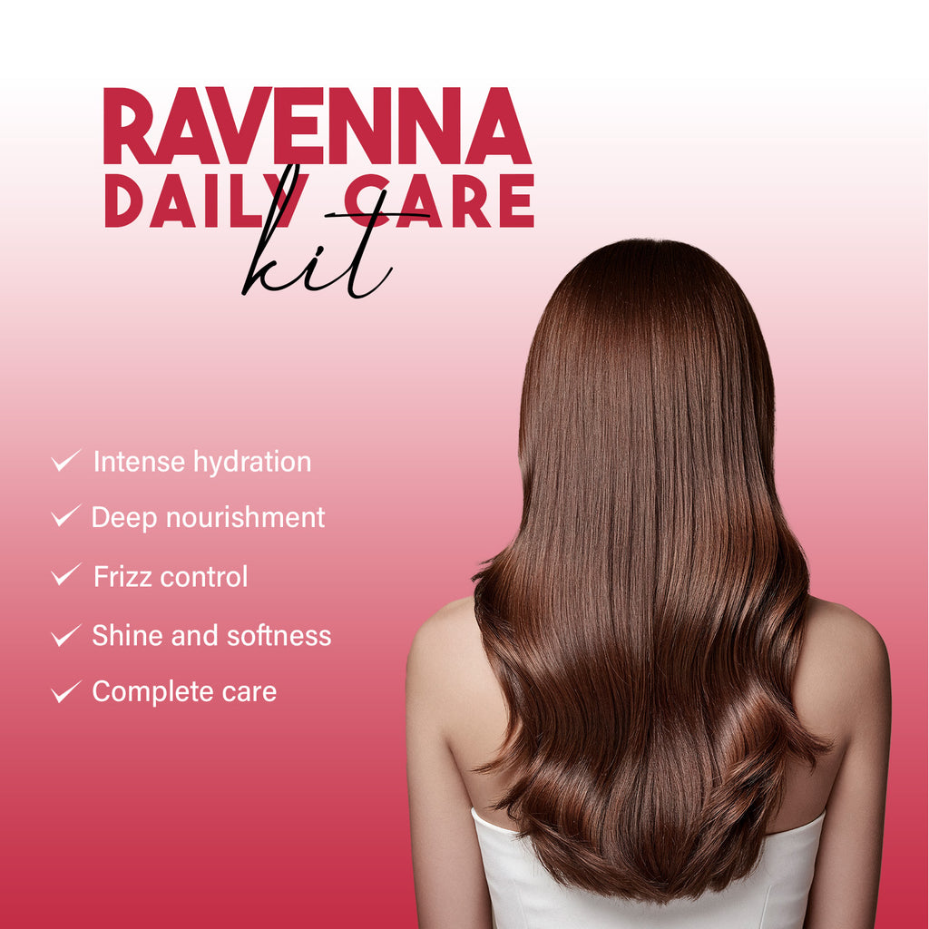 The Ravenna Daily Care Kit is the perfect solution for a complete hair care routine. Composed of Shampoo and Conditioner, the Hair Mask, and the new Ravenna Repair Oil, this kit provides gentle cleansing, deep hydration, strengthening, and repair of your hair, leaving it softer, nourished, and with a radiant shine.